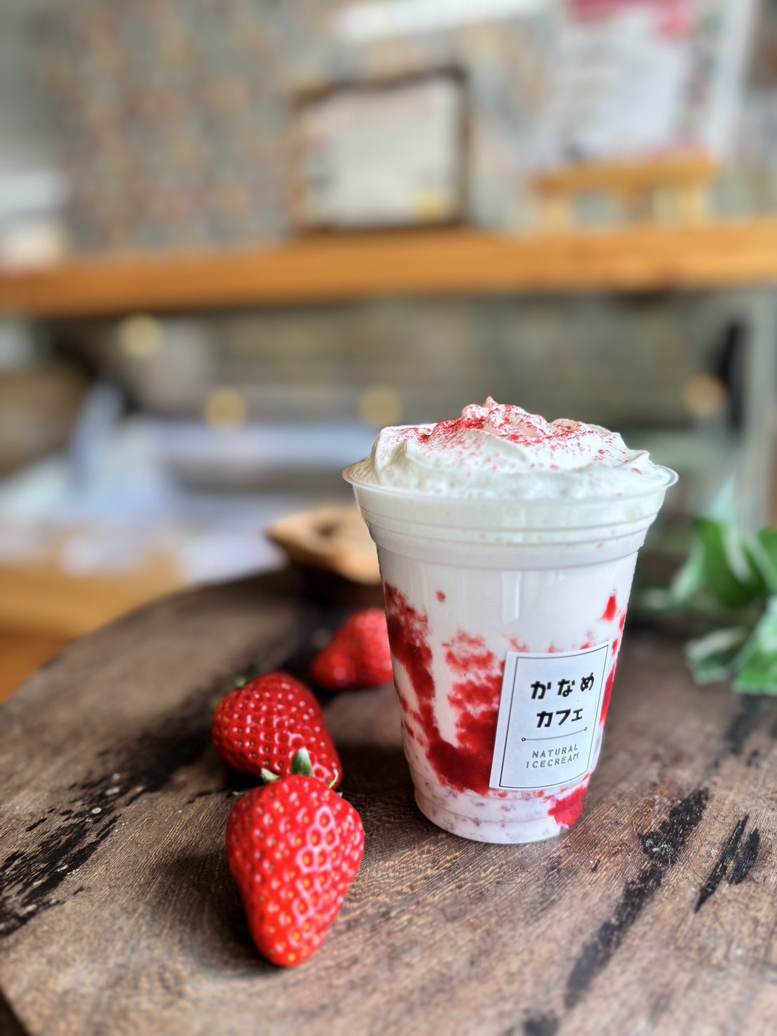かなめカフェ店頭: 優しい甘さの「いちごみるく」を販売。